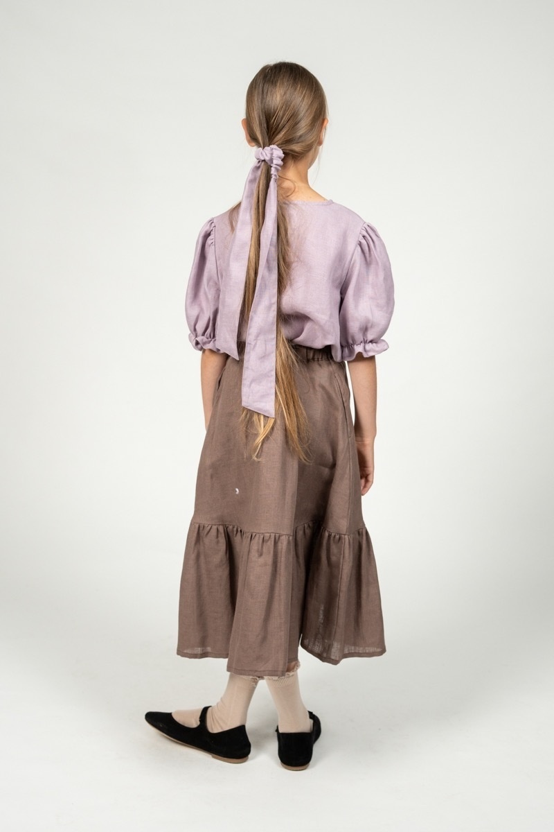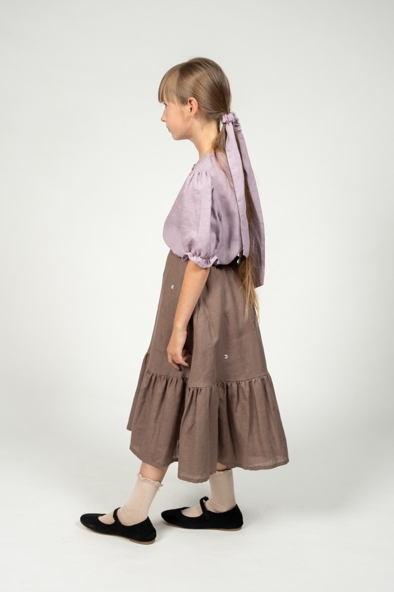 Long skirt Amie with a well-fitting yet comfortable, partially elastic waist. A wide range of colors and a lovely ruffle detail at the bottom makes the skirt feel as if it was picked straight from the flower garden just for your little one.