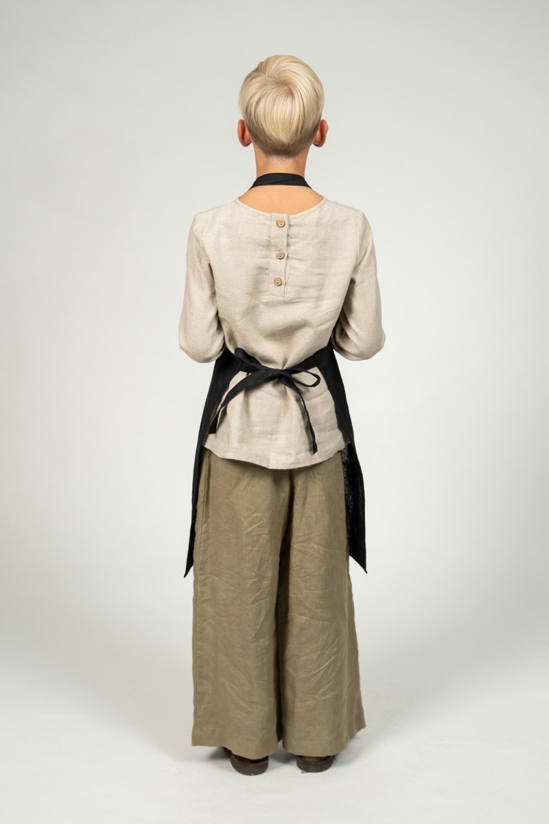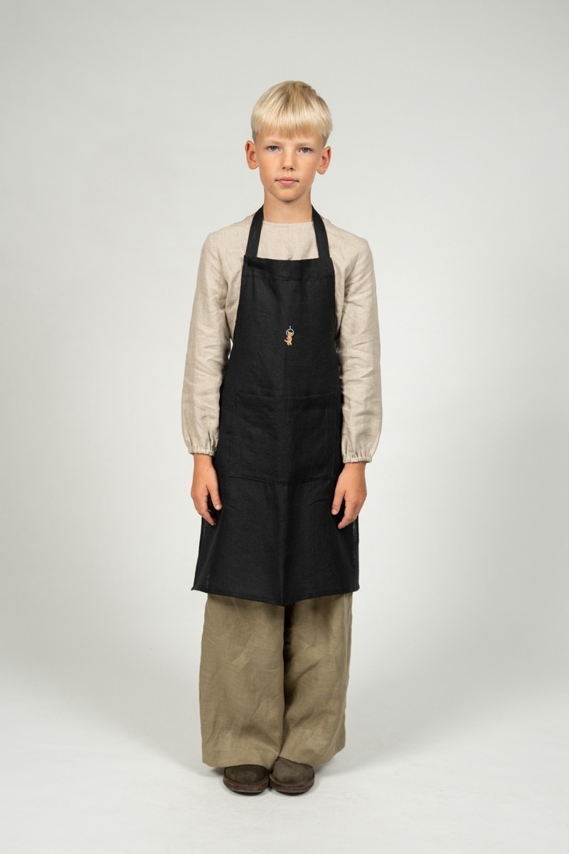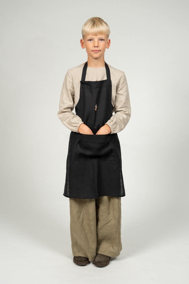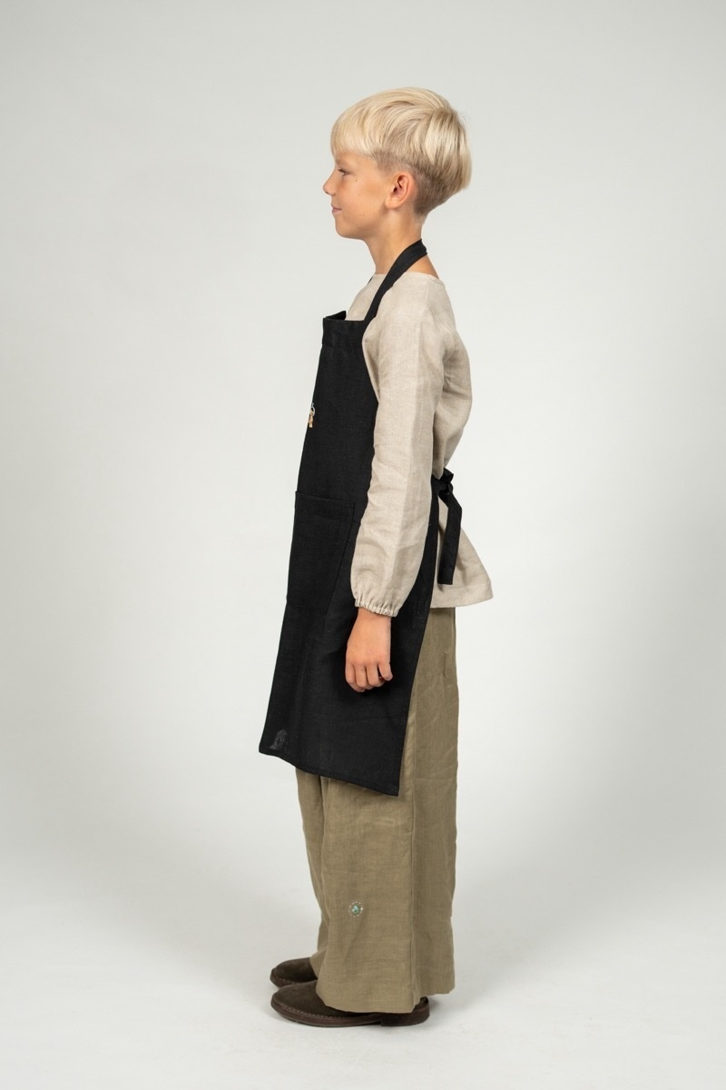 The traditional apron is ideal for playing outside in the garden or helping out in the kitchen. Made out of natural linen, it is pleasant to wear and keeps your little ones’ clothes clean for years to come.In the pictures: