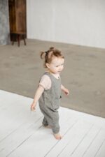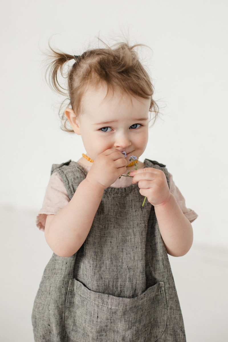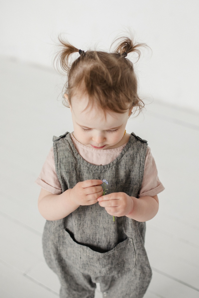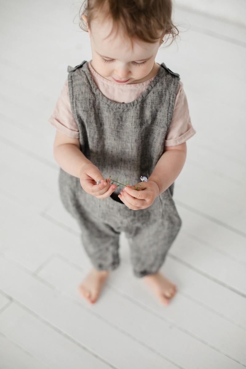This linen jumpsuit for kids was created to ensure unlimited freedom of movement. With its wide choice of sizes, colors, hand-made embroideries, and a roomy and comfortable design, it is ideal for playing and exploring the world. In the pictures: