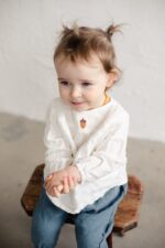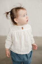 A lovely blouse with yoke detail – a daily choice with a dash of charm. We added coconut buttons on the back for an easy and comfortable change.In the pictures: