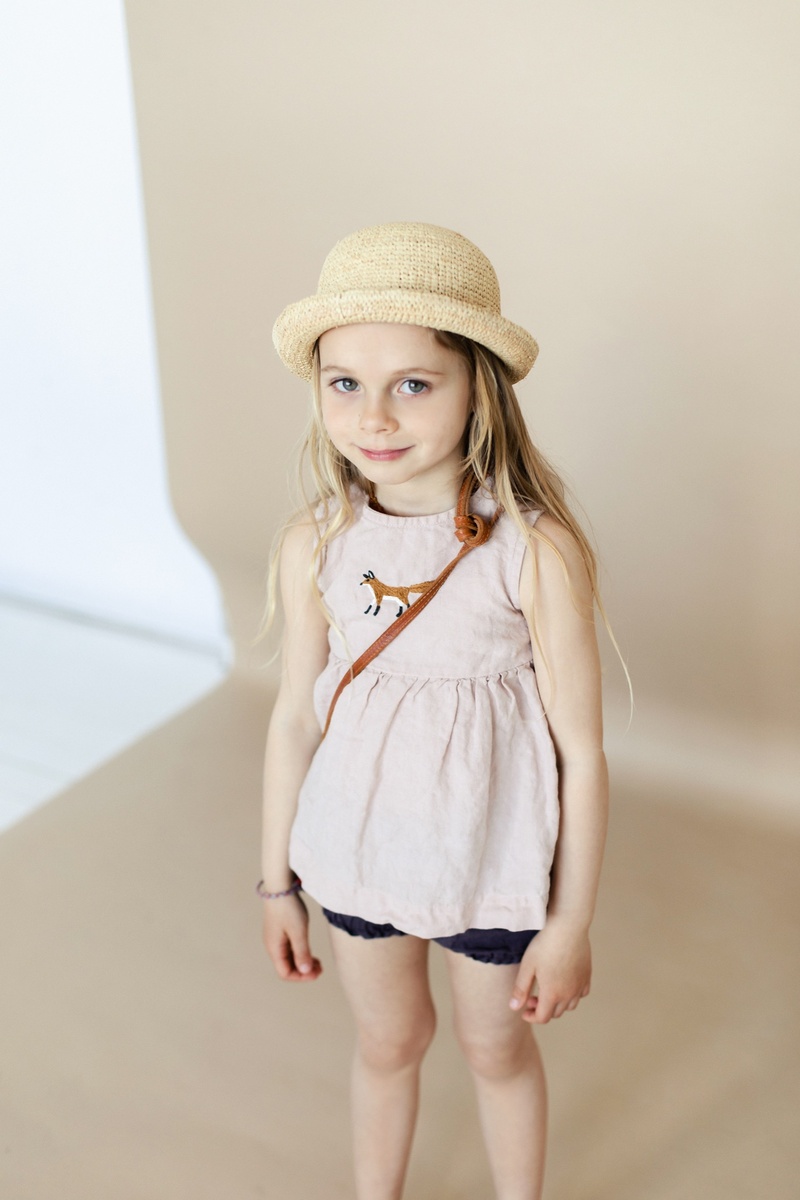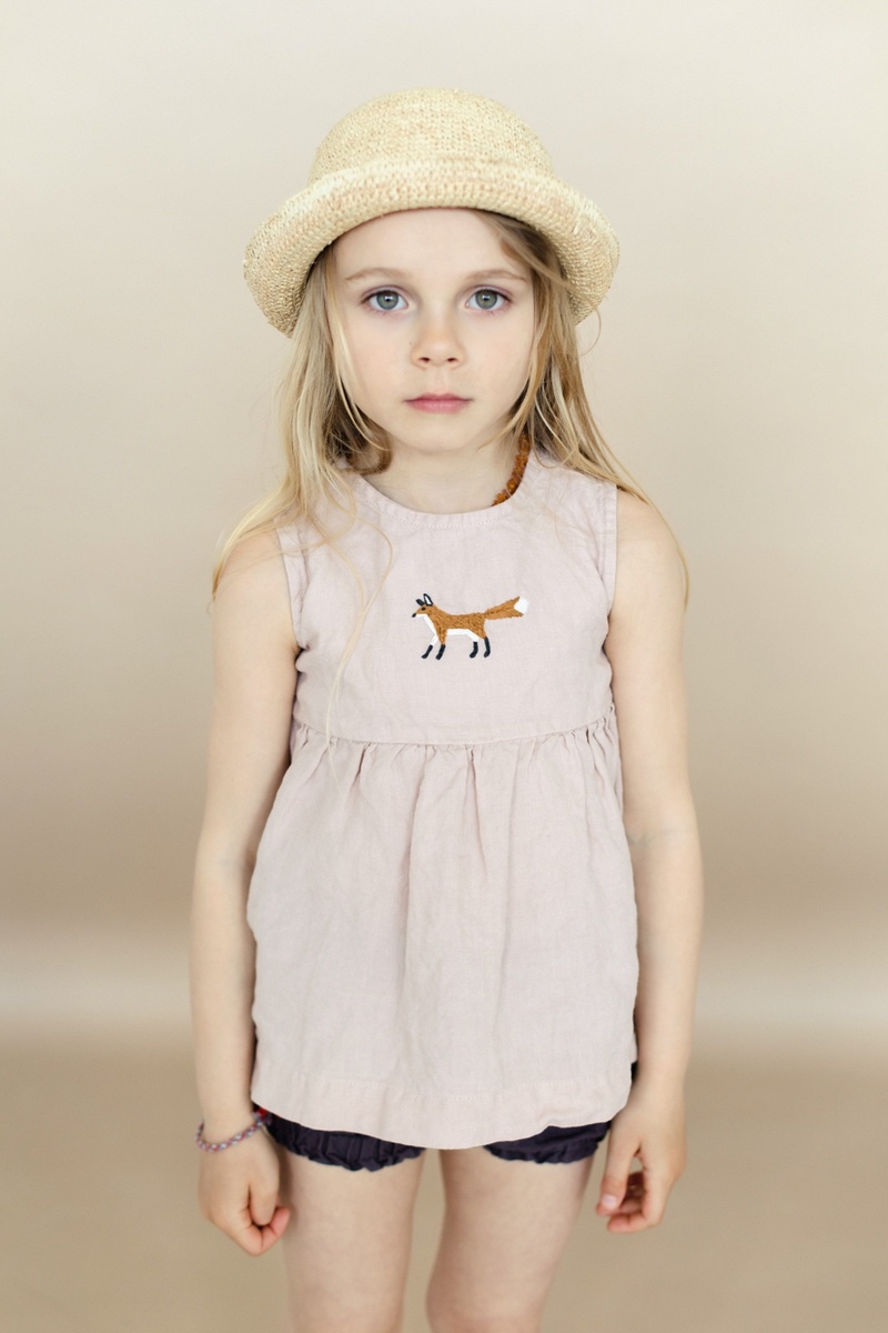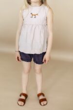 The sleeveless linen top has unlimited freedom of movement for playing and exploring the world. The charming empire waist detail adds playfulness and makes it fit for any celebration.