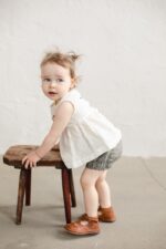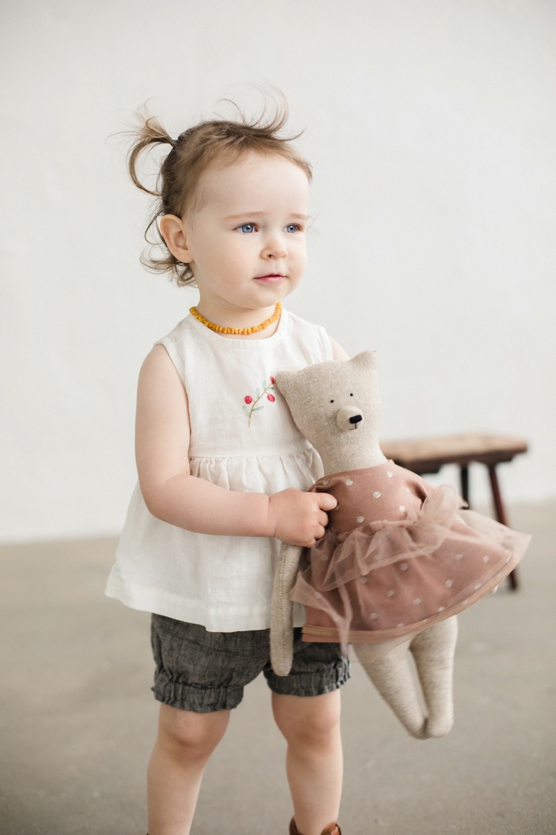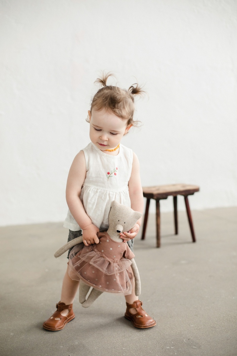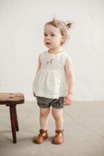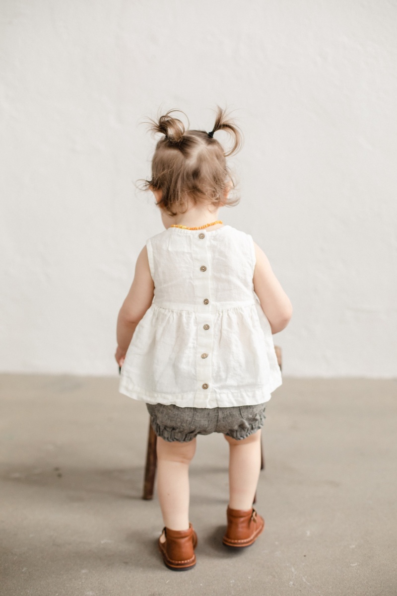 The sleeveless linen top has unlimited freedom of movement for playing and exploring the world. The charming empire waist detail adds playfulness and makes it fit for any celebration.In the pictures: