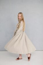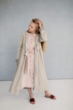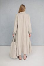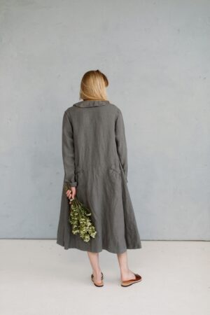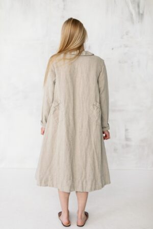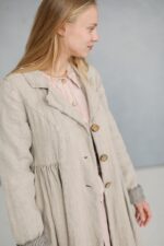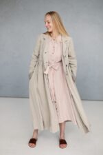 The linen coat Lilly is our take on the classic collar coat for women. While still keeping that elegant look, this long coat offers a roomy design and added soft feel with the light gathering at the raised waistline, earthy coconut buttons, and an eye-catching sleeve lining.