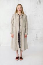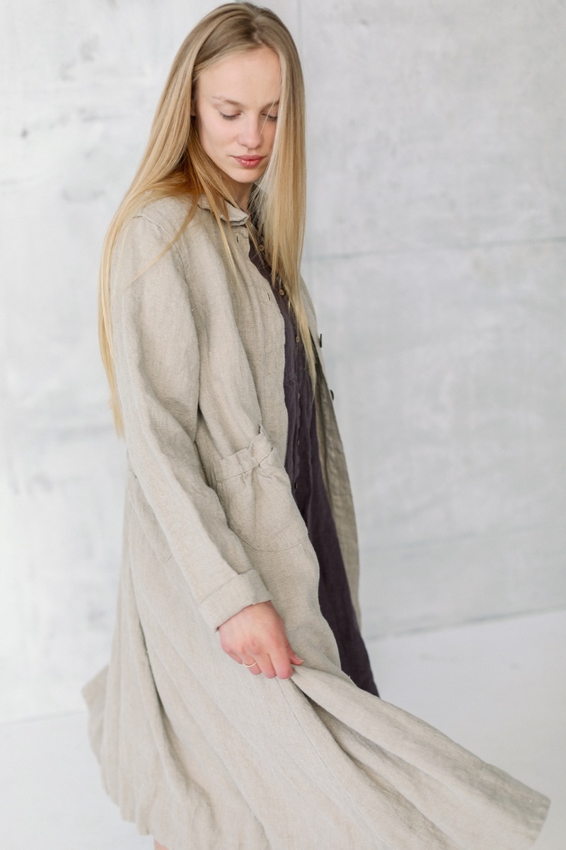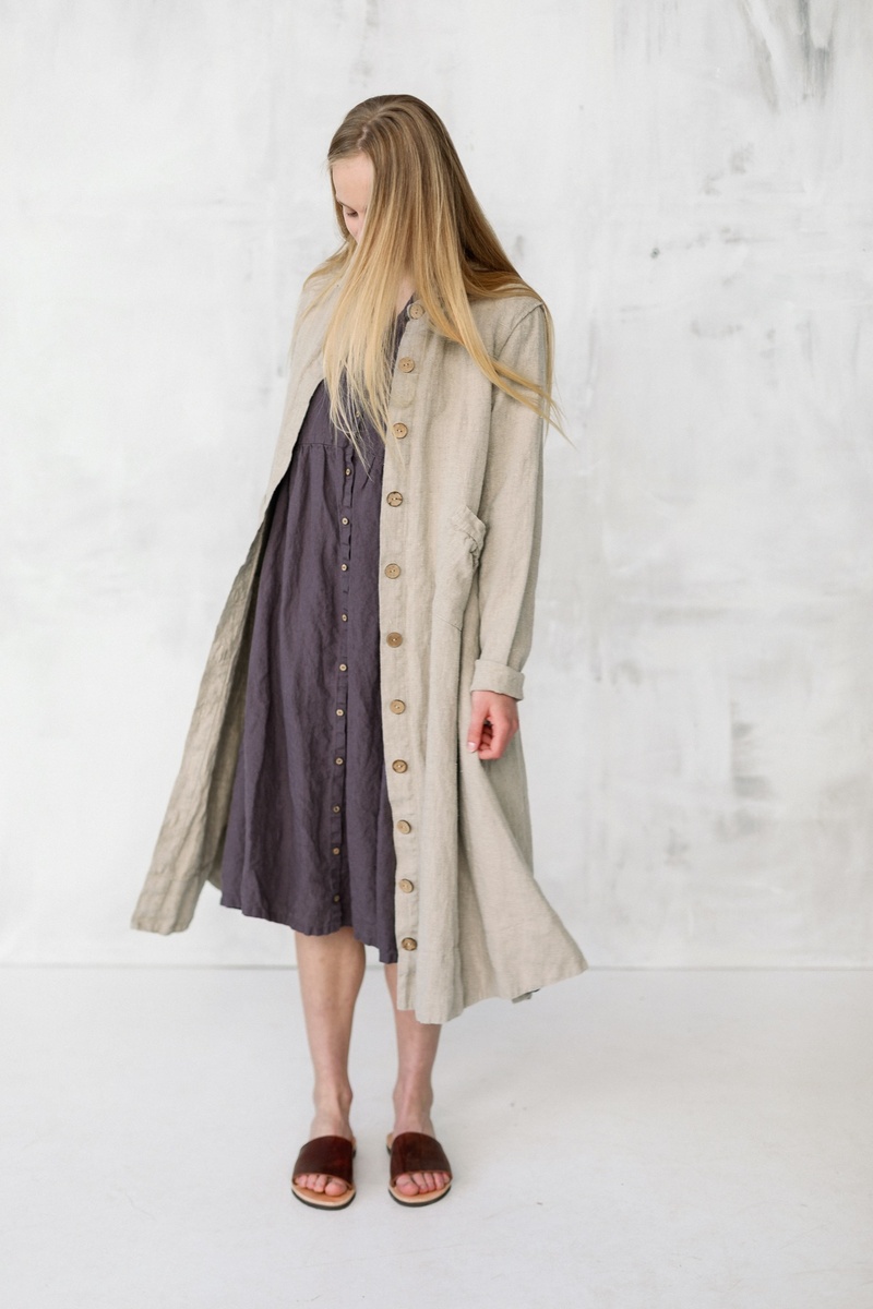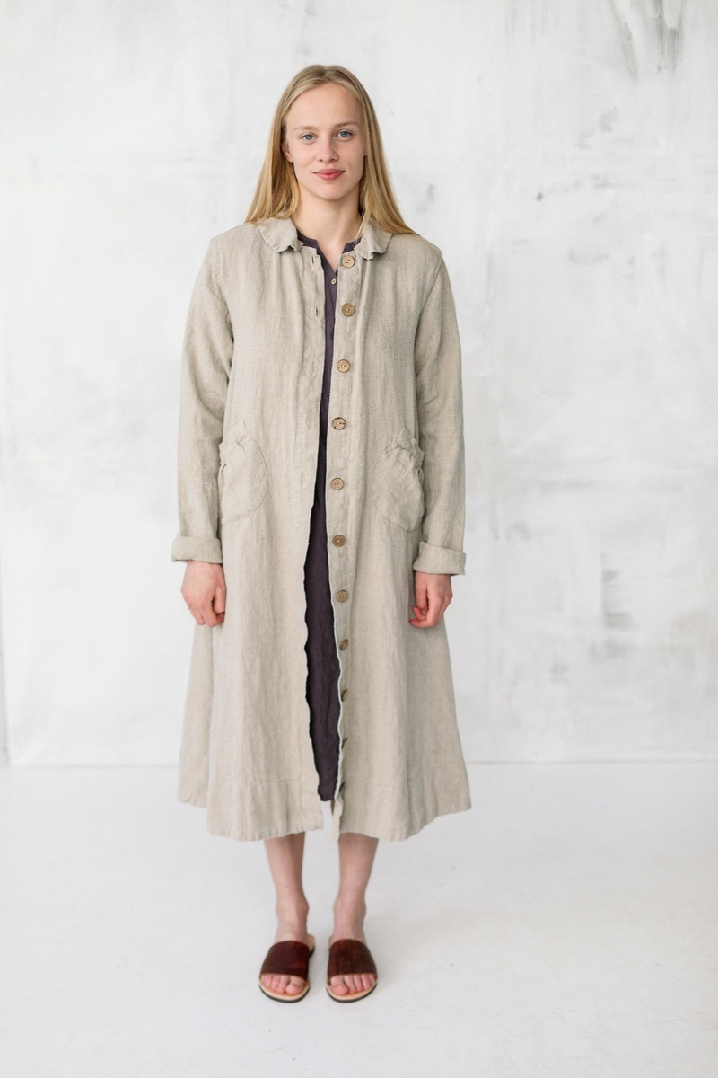 This linen coat is inspired by our kids’ coat offers the same romantic look. A-line design and relaxed fit will suit all types of figures, and the heavy-weight linen will keep you warm even on cooler days.In the pictures: