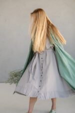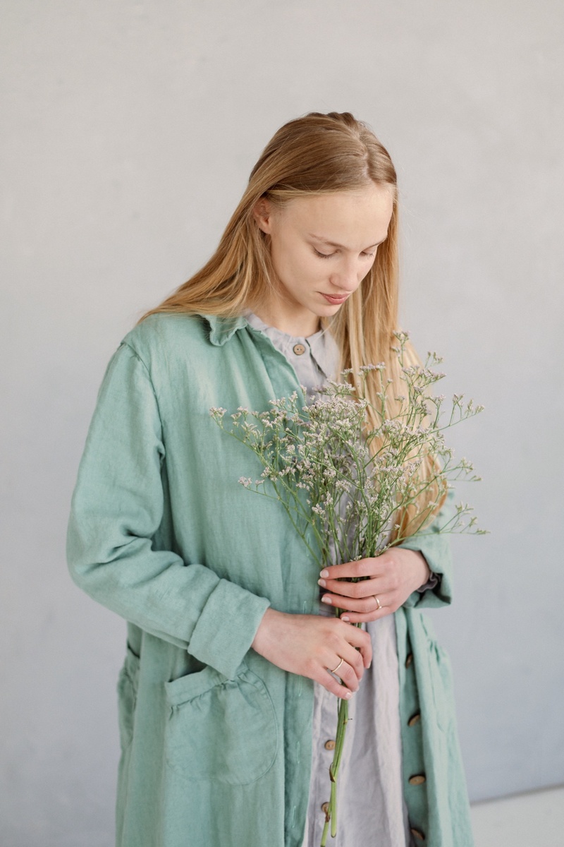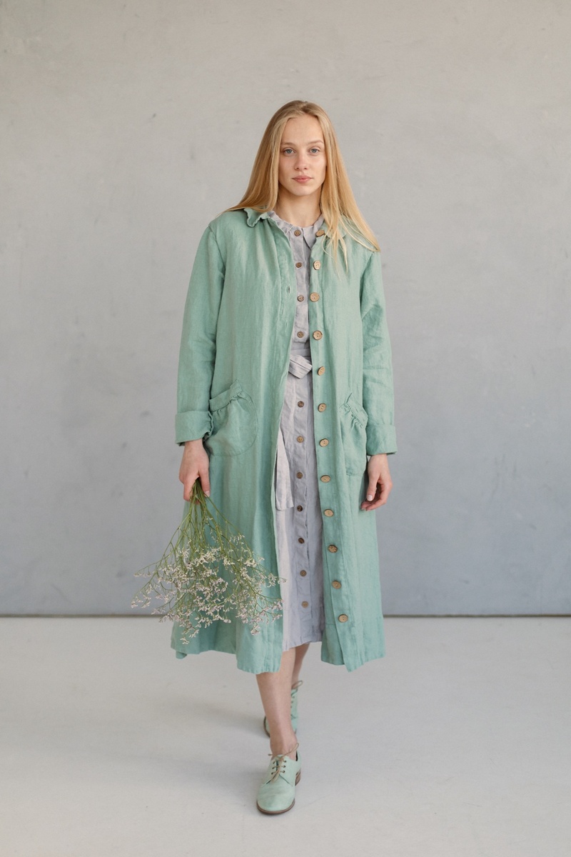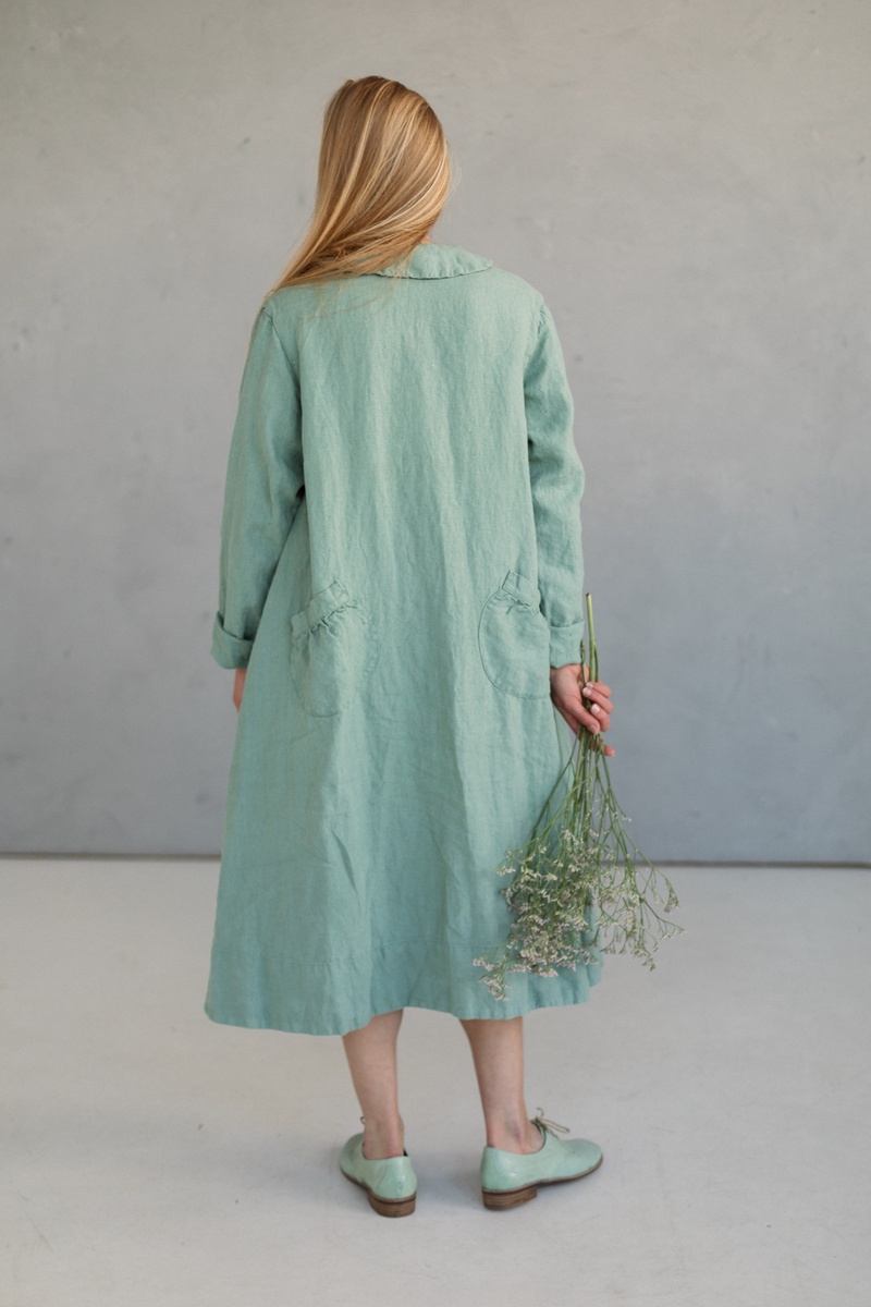 This linen coat is inspired by our kids’ coat offers the same romantic look. A-line design and relaxed fit will suit all types of figures, and the heavy-weight linen will keep you warm even on cooler days.In the pictures: