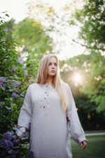 Designed with a modern fluid life in mind, this one-size dress is a true catch! Roomy cut, styled with a long linen belt (or without), looks great on any body shape. Combined with the possibility to wear the item buttons on the front or the back, the brilliant design allows you to discover this dress every day anew.In the pictures: