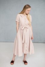 Our version of a classical collar dress. Long and soft, this comfy dress still keeps the classic elegant look. The added belt gives you a new silhouette, allowing the dress to adjust to your mood.In the pictures: