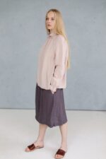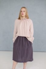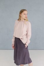 Made from soft linen, this midi linen skirt Elise feels incredibly smooth and pleasant on the skin. The skirt has a ruffled elastic waistband which adds an extra element of softness to the overall look.In the pictures: