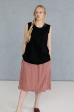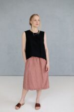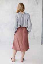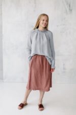 Made from soft linen, this midi linen skirt Elise feels incredibly smooth and pleasant on the skin. The skirt has a ruffled elastic waistband which adds an extra element of softness to the overall look.In the pictures: