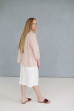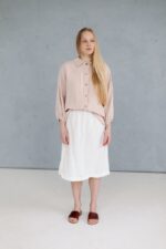 Made from soft linen, this midi linen skirt Elise feels incredibly smooth and pleasant on the skin. The skirt has a ruffled elastic waistband which adds an extra element of softness to the overall look.In the pictures: