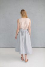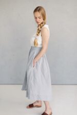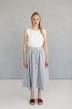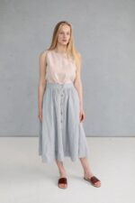 Easily matched, this buttoned mid-calf linen skirt is a must in your wardrobe. Pair this flowy skirt with a simple top or an elegant shirt, and be on your way for a stroll in a park or a summer date.